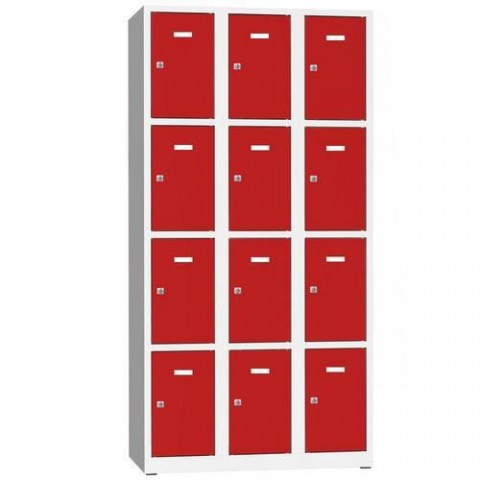 Svařované boxové šatní skříňky s výztuhami vhodné pro odkládání věcí na pracovištích, převlékárnách nebo sportovních klubech. Účinné odvádění vlhkosti z oděvů větracími otvory na zadní straně. Dvířka boxů jsou zavěšená na vnitřních pantech. Tlumení hluku při zavírání dvířek zajišťují plastvé dorazy. Skříň na vyvýšeném rámu, který je osazen čtyřmi plastovými patkami. Snadno udržovatelný hladký prostor uvnitř boxu. Světlost dvířek 39,6 x 20,9 cm.Svařované šatní skříně Philip, 12 boxů, cylindrický zámek