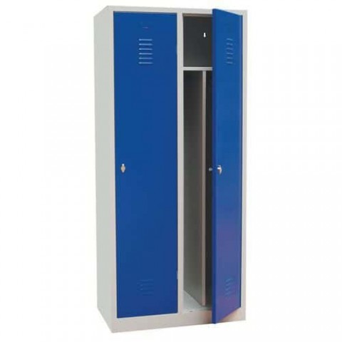 Svařované šatní skříně prémiové kvality skládající se ze dvou samostatně uzamykatelných oddílů, přičemž každý oddíl je vertikálně rozdělen mezistěnou umožňující odložení čistých a špinavých oděvů. Bezpečnost zvyšuje zejména vyztužení dveří po celé délce, a to včetně rámu, a perforace dveří, kterými nelze pohlédnout dovnitř. Šatník z ocelového plechu tloušťky 0,7 mm. Účinné odvádění vlhkosti z oděvů větracími otvory na dveřích. Dveře jsou uloženy na vnitřních výsuvných pantech s možností otevření dveří až 180° a jsou opatřeny plastovými nárazníky pro snížení hluku při zavírání. Uzamykání otočným uzávěrem na visací zámek (lze dokoupit jako příslušenství) nebo cylindrickým zámkem na klíč. Možnost umístění štítku se jménem v horní části dveří. Na vyvýšeném rámu. Možnost dokoupení laviček pod šatní skříně a šikmých stříšek.Svařované šatní skříně s mezistěnou Manutan Expert DURO PROFI, 2 oddíly