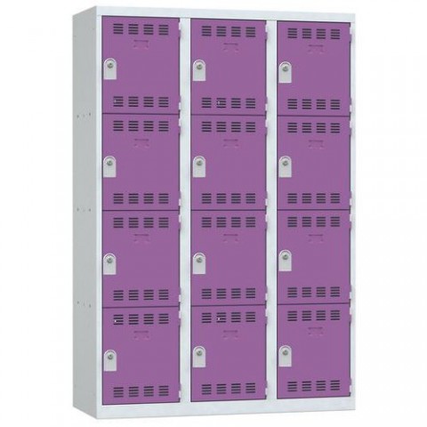 Více-oddílová šatní skříň svařovaná z ocelového plechu tloušťky 0,7 mm. Jednotlivé oddíly jsou samostatně uzamykatelné cylindrickým zámkem se dvěma klíči. Perforovaná dvířka zajišťují účinné odvětrávání vnitřního prostoru. Možnost umístění štítku se jménem.Svařované šatní skříně Vinco, 3 sloupce, 12 boxů, 400 mm, cylindrický zámek