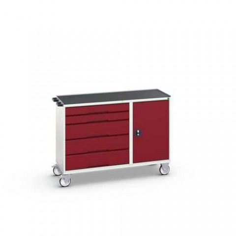 Mobilní údržbový vozík Bott Verso s horní pracovní plochou tloušťky 3 cm typu multiplex/linoleum nebo ohraněný plech s rohoží. Nosnost až 200 kg, robustní svařovaná ocelová konstrukce, povrchová úprava práškovým lakem. Centrálně uzamykatelné zásuvky s výškou 2 x 10 a 3 x 17,5 cm, s nosností 50 kg a 100% výsuvem na válečkových ložiskách. Uzamykatelná skříňka s výškou dveří 72,5 cm, uvnitř pozinkovaná výškově nastavitelná police s nosností 75 kg. Ergonomické rukojeti zásuvek s popisovatelnou lištou, systém blokace otevření více zásuvek najednou. Dvě pevná a dvě otočná kola s brzdou o průměru 12,5 cm, manipulaci usnadňují madla.Údržový zásuvkový vozík Bott Verso, 98 x 130 x 55/60 cm, 5 zásuvek, skříňka, multiplex/linoleum/rohož