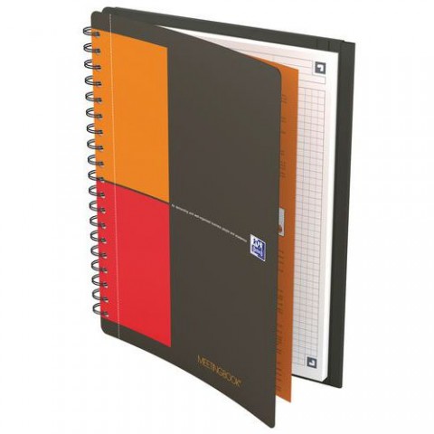 Pružný a odolný polypropylenový obal zápisníku Meetingbook se spirálovou vazbou udrží vaše poznámky a dokumenty v bezpečí a chráněné. Praktické: Je vybaven třemi chlopněmi na zadní straně notebooku a elastickými popruhy pro uložení všech dokumentů. Děrované vyjímatelné listy pro snadné uložení do pořadače.Zápisník Oxford Meetingbook formát A4 až A5
