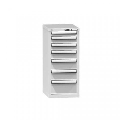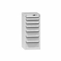 Zásuvková skříň je opatřená mechanismem centrálního zamykání a blokace zásuvek. Zásuvky jsou základním skladovacím prvkem, a proto splňují vysoké požadavky na pevnost a stabilitu. Korpusy zásuvkových skříní tvoří svařenec jednotlivých konstrukčních dílů z kvalitních ocelových plechů. Vnitřní konstrukce korpusů je opatřena perforací po 25 mm. Tuto perforaci využíváme k uchycení vodicích lišt zásuvek, jejich výškovému uspořádání a nakonfigurování požadované zásuvkové sestavy. Přestavování vodicích lišt nebo háčků polic probíhá jednoduše a velice rychle bez použití nástrojů.Zásuvkové skříně ZL6, 442 x 600 x 990 mm