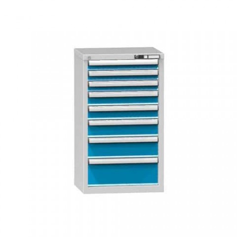Zásuvková skříň je opatřená mechanismem centrálního zamykání a blokace zásuvek. Zásuvky jsou základním skladovacím prvkem, a proto splňují vysoké požadavky na pevnost a stabilitu. Korpusy zásuvkových skříní tvoří svařenec jednotlivých konstrukčních dílů z kvalitních ocelových plechů. Vnitřní konstrukce korpusů je opatřena perforací po 25 mm. Tuto perforaci využíváme k uchycení vodicích lišt zásuvek, jejich výškovému uspořádání a nakonfigurování požadované zásuvkové sestavy. Přestavování vodicích lišt nebo háčků polic probíhá jednoduše a velice rychle bez použití nástrojů.Zásuvkové skříně ZN5, 578 x 464 x 990 mm
